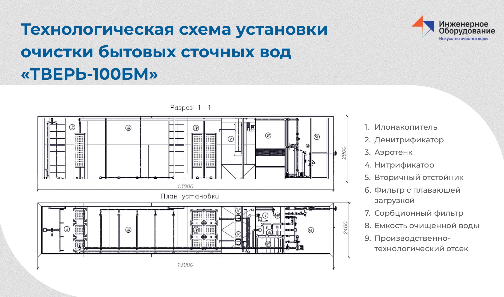 «ТВЕРЬ-БМ» – локальные очистные сооружения блочно-модульного типа, предназначенные для биологической очистки хозяйственно-бытовых и аналогичных по составу сточных вод. Станции выпускаются в закрытом исполнении и собираются из компактных блок-модулей, установленных на фундамент. Такое решение обеспечивает утепленное здание с размещением всего технологического оборудования внутри, а также значительно сокращает сроки монтажа и ввода объекта в эксплуатацию.